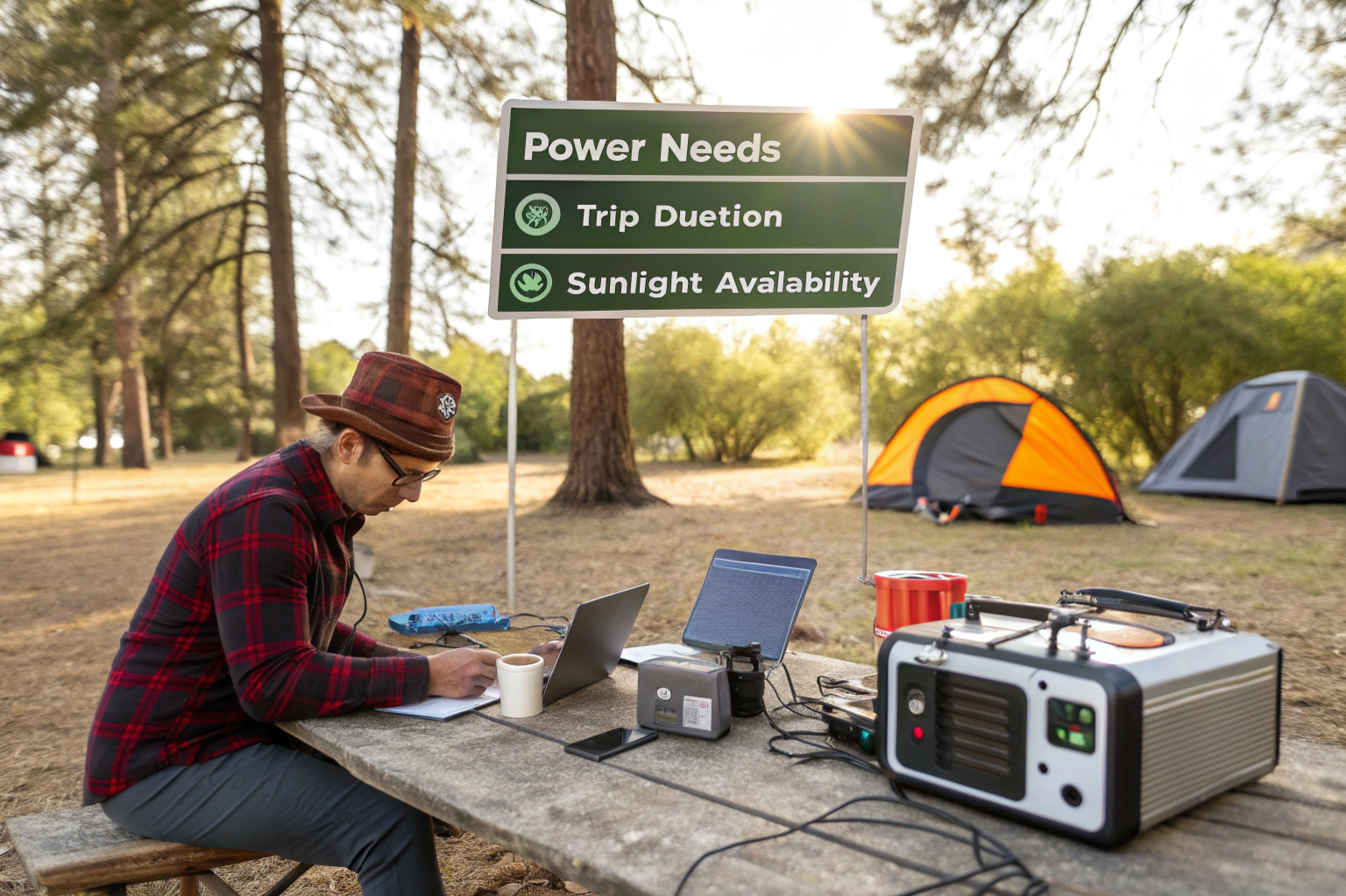 To choose the right portable power source, match your power needs, trip duration, and available sunlight with the right battery and charging method.